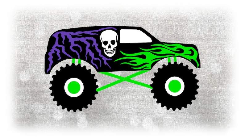 Simple Monster Truck Svg, Layered Black Monster Truck White Skull Green Flames Purple Lightning SVG